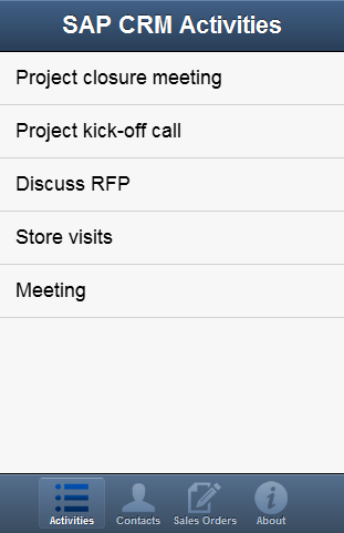 Before we can start building the app we need to understand the content and structure of the data we will fetch from the server. Our first basic app will fetch Activity data from the SAP CRM demo system. Let’s lookup the activities in the SAP CRM system, so we know what activity data to expect: