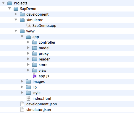 I created the following folders structure to house the demo project. Please note that the www folder contains all the code which we developed earlier. The app folder contains a typical folder layout for a Sencha Touch app.